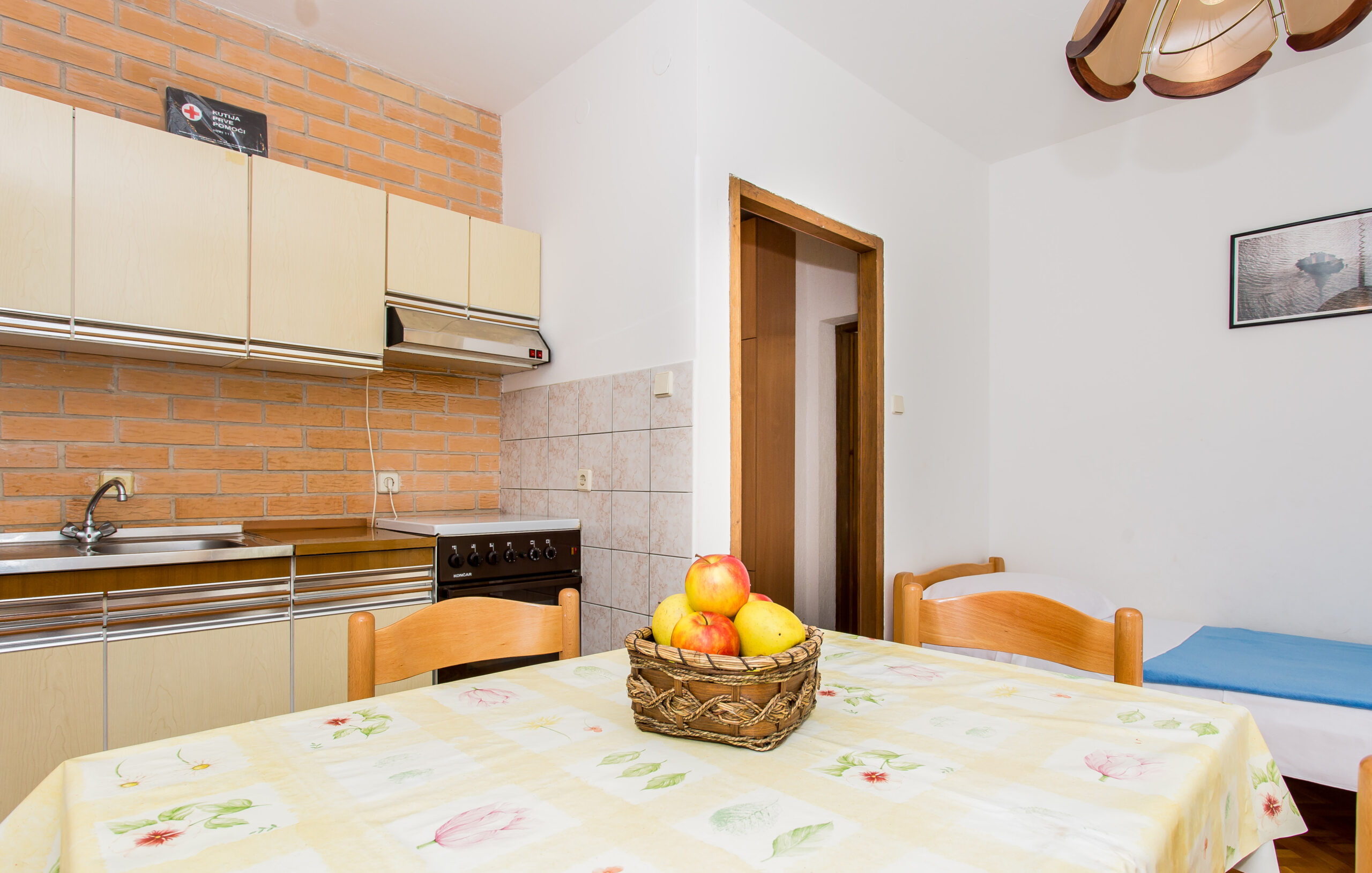 The modern and comfortably furnished apartment is located on the 1st floor and offers space for 2 – 3 people. In the apartment you will find a living/dining area with a well equipped kitchen, an additional bed for 1 person , a bedroom with a double bed and a bathroom with a shower. The apartment … Continue reading “Pension Tina – APP 5 (app 1/2 + 1) *** nice sea view”