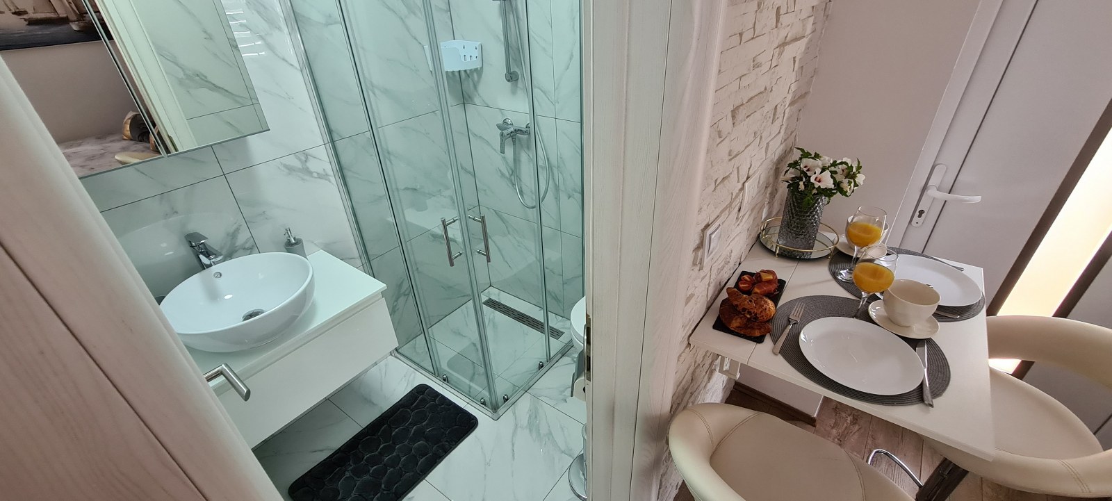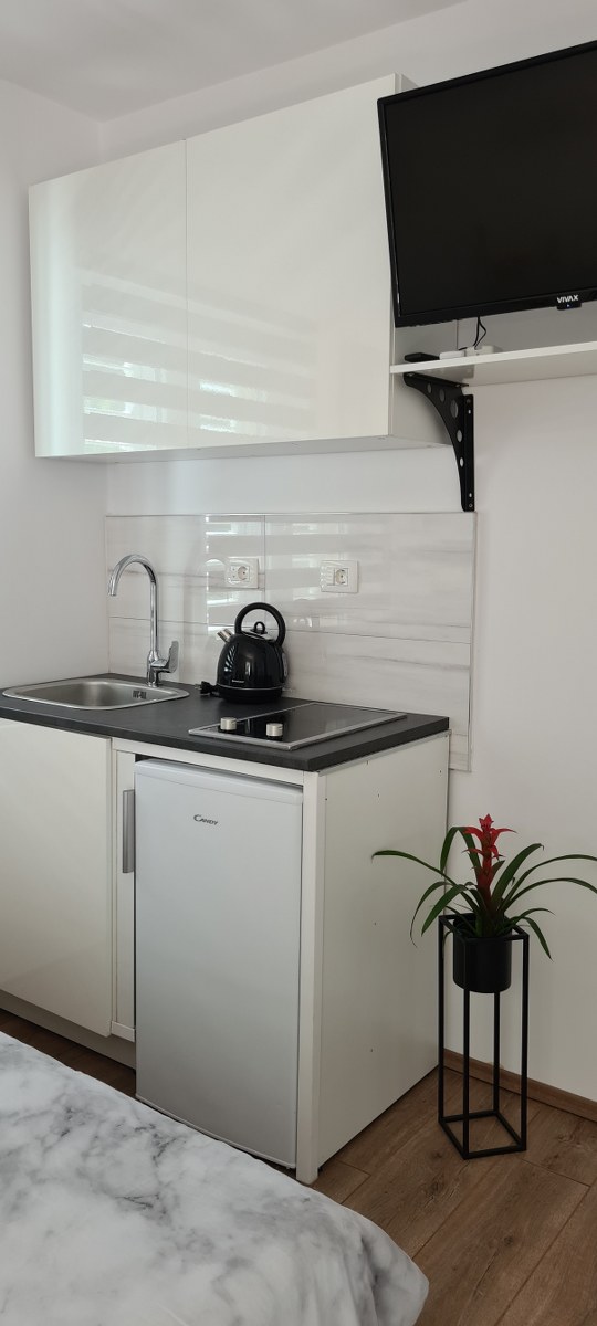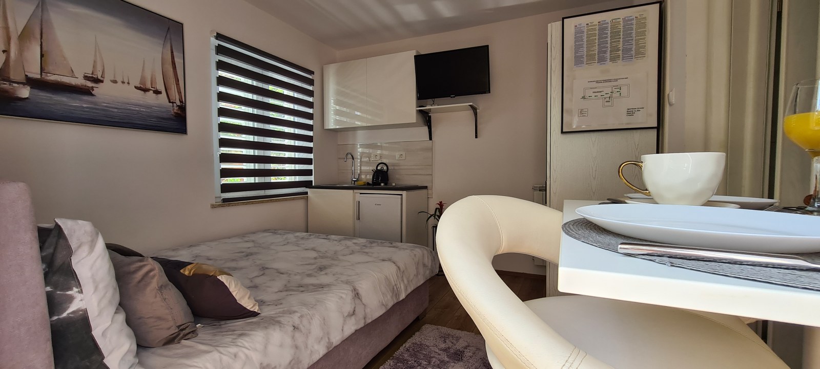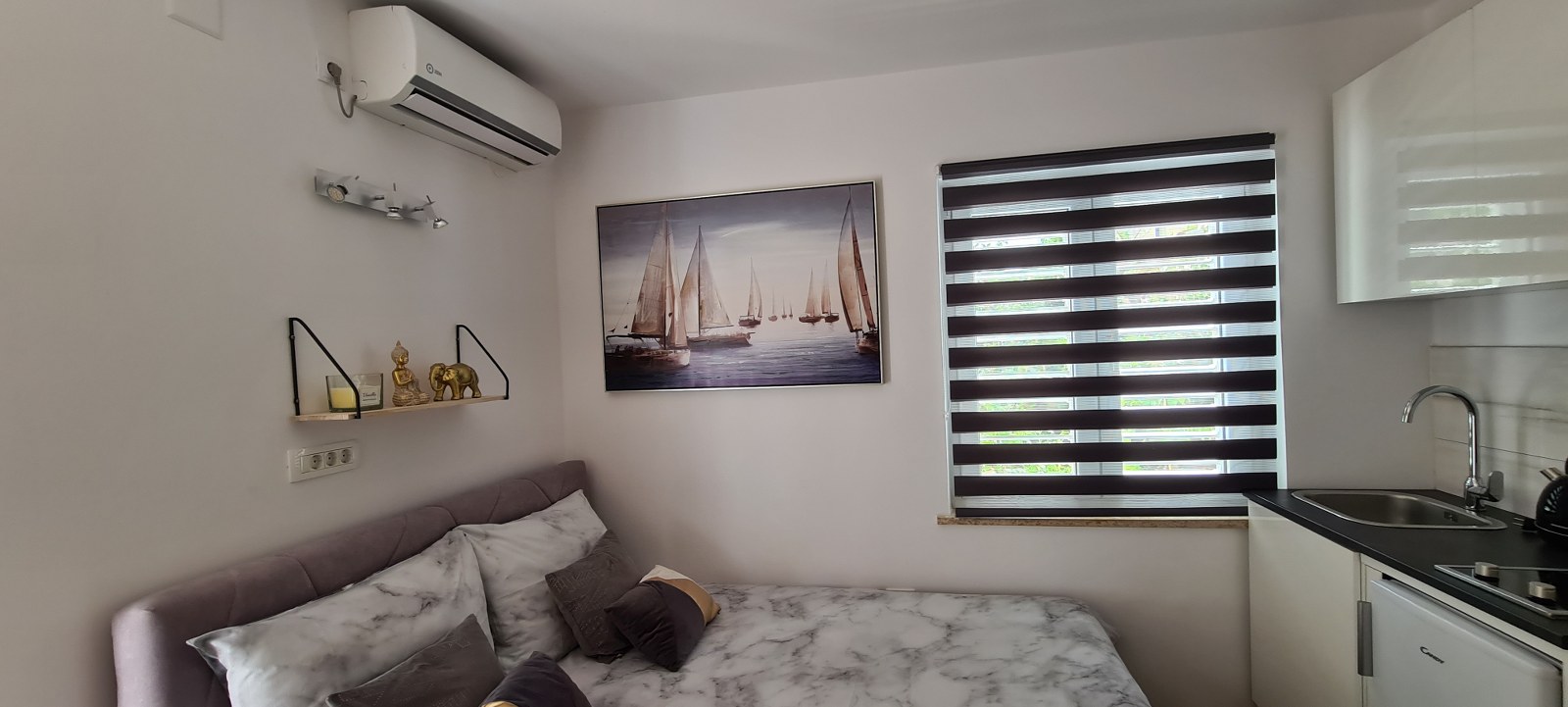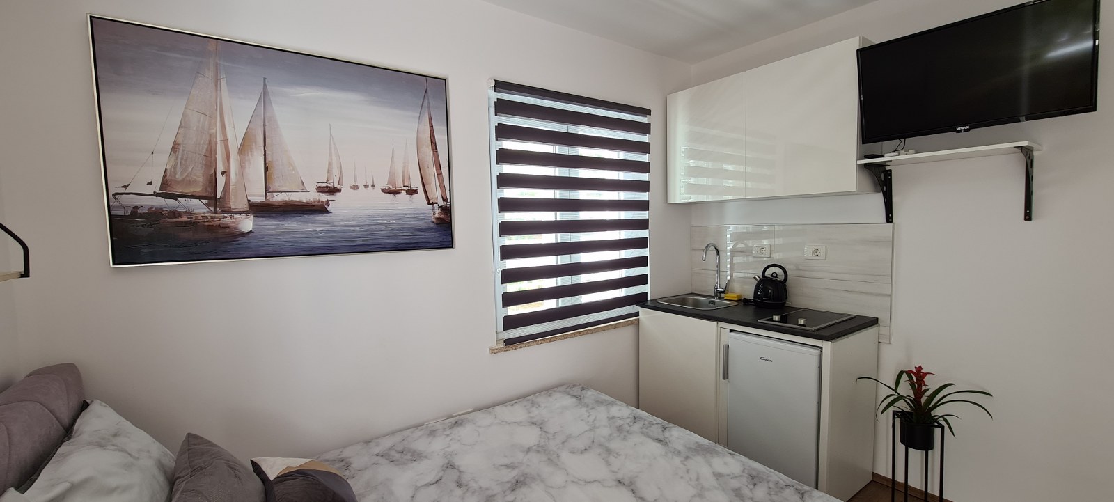 Mali studio apartman nalazi se u prizemlju i pogodan je za 2 osobe. Studio ima bračni krevet, malu čajnu kuhinju i kupaonicu s tušem. Studio je klimatiziran i ima satelitsku TV i internet. Studio također ima vlastitu terasu.